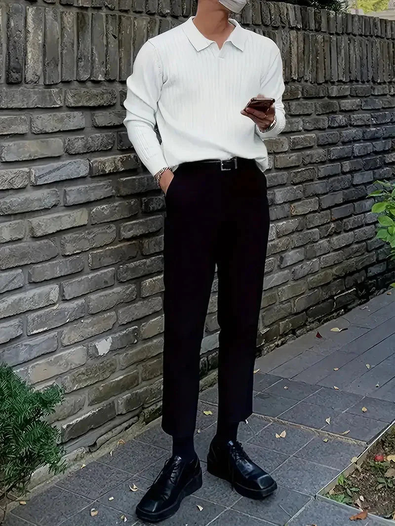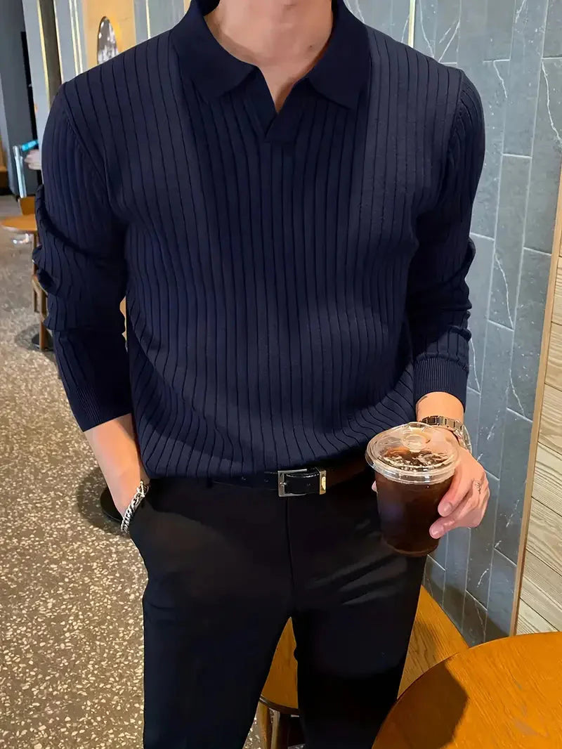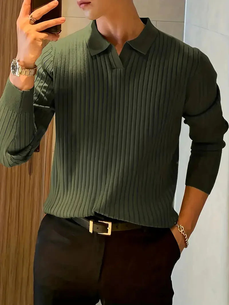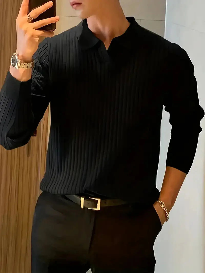 Erweitern Sie Ihre Garderobe mit diesem gerippten Strickpullover-Shirt. Entworfen mit einer klassischen gerippten Textur, ist dieses vielseitige Stück perfekt für sowohl geschäftliche als auch lässige Anlässe. Der glatte, leichte Stoff bietet sowohl Komfort als auch Stil und lässt sich leicht schichten oder alleine tragen.